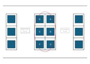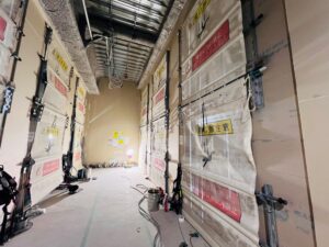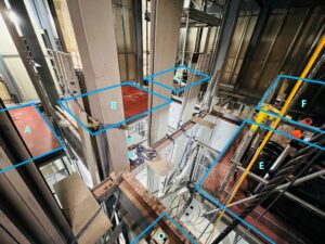 カゴ(乗場)もまだ壁がない状態なので、今は、隣や、奥のエレベーターが見えています。