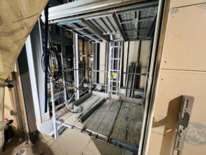 まだカゴ(乗場)を組み立てる前で、足場が組まれている状態でした。
