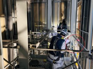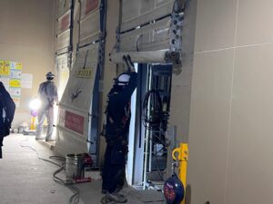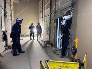 朝とお昼からの一日2回作業開始前に、エレベーター作業員全員で集まって
