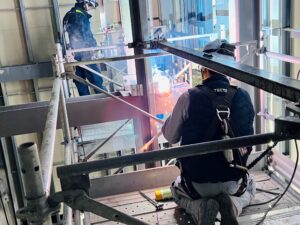 作業中は、高所作業における墜落防止用の命綱(ランヤード)のフックを手すりにしっかりかけて作業します。